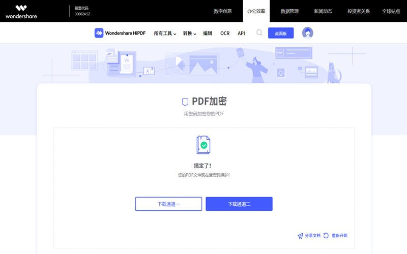 4.密码设定完成点击加密,系统提示搞定后可以选择现在到本地或者直接分享文档,通过邮箱发出。在传递文当前先用日韩精品久久久久PDF做加密处理然后直接邮箱发出既可以提高安全性也不会太耽误工作。