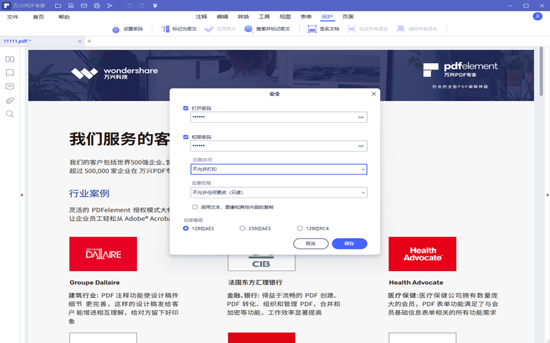 3.打开密码和权限属于可多选,加密等级是必选。打开密码和在线PDF加密的一样。权限密码主要涉及到文档打印质量和跟中修改权限是否限制。这些用户可以根据自己的需要来设定。