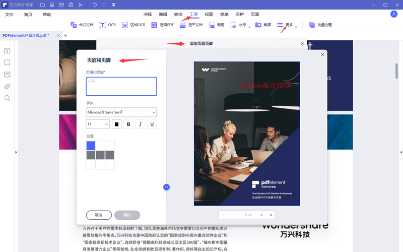 3.实际上,用户也可以在工具栏的更多工具里边找到页眉页脚功能选项,选择添加页眉页脚进入到添加页眉页脚操作界面,点击创建一个模板进入页眉页脚设置界面。