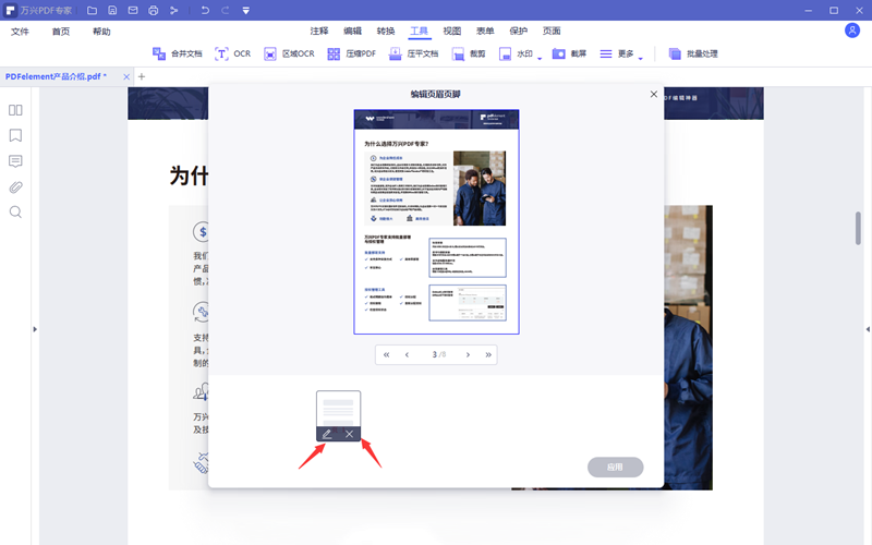 7.模板设定完毕后点击应用即可使用到在编辑的PDF文档上,需要修改页码属性或者删除页码的时候只用找到编辑页眉页脚的功能即可,打开后会看到PDF正在使用的页眉页脚模板,选择模板上的编辑或者删除按钮就可以执行相应的操作了。