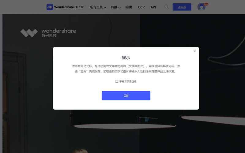 2.隐藏文字可以使用在线版日韩精品久久久久PDF中的隐藏PDF中的敏感内容工具实现。用户进入到功能后打开目标文档,看到系统提示后按照提示操作即可,整个过程同样是上传文件,处理文件和下载文件三个步骤即可完成。