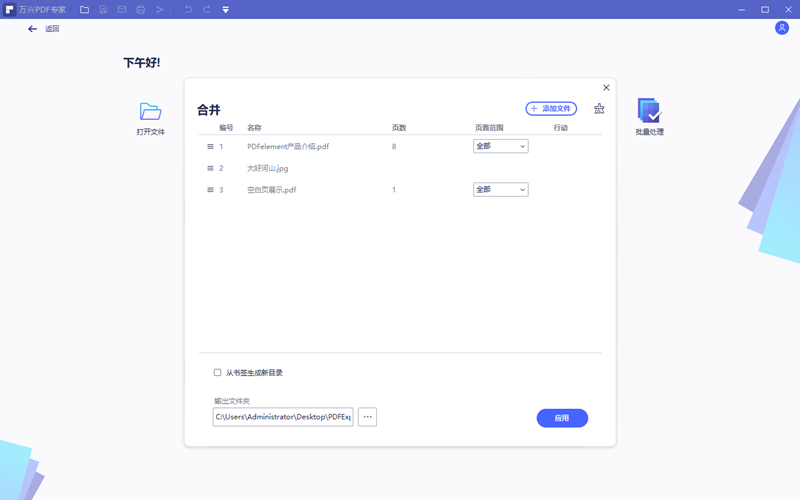 第三步需要整合的文件添加完毕后点击应用,软件会自动完成合并操作,需要的时间和合并文档的大小有关。合并完成后系统会自动打开新生成的合并为标题的PDF文档。