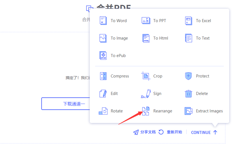 下载完毕后回到合并PDF界面点击CONTINUE选择REARRANGE进入到页面排序功能界面,根据提示上传合并后的文档。然后用拖放的方式对PDF的页面进行重新排序。这里能做的操作没有Windows版丰富