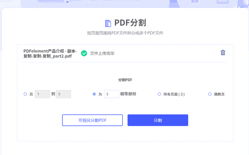 步骤3、文档上传完毕,软件自动进入到PDF分割设置的普通界面,在这里用户可以根据需求选择适合自己的设置,这里可以通过设置分割成跟页数相同的等份把整个文档的每一页都分割出来。设定完毕后点击分割即可等待结果。