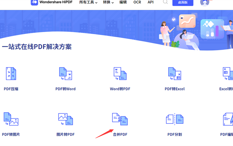 第一步、打开网址http://www.hipdf.cn/,在日韩精品久久久久PDF一站式在线PDF解决方案中找到合并PDF功能图标。