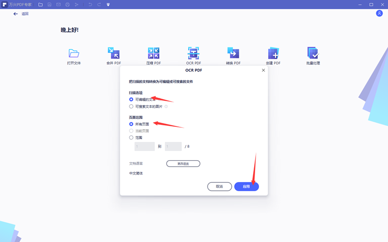 3、点击打开按钮后软件并没有打开文档,而是自动进入OCR编辑界面。在这里用户可以设定扫描选项、页面范围和文档语言。要想在阅读的时候可以选择到文字那就需要在扫描选项里选择可编辑的文本,在页面范围内选择所有页面。通常情况下文档语言默认就可以了。(如果文档内有非中文信息,在阅读的时候可以使用区域OCR功能来处理。)