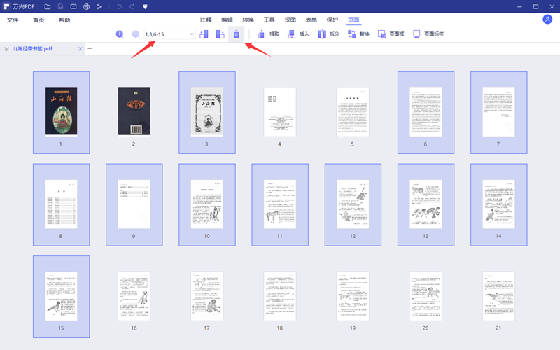 步骤3、在页面功能的主窗口展示出来的所有页面缩放图中,删除掉不要的页面。删除的方法可以是点击对应页面上方的删除按钮,也可以全部选定不需要的页面然后点击软件上方的删除按钮一次性删除。