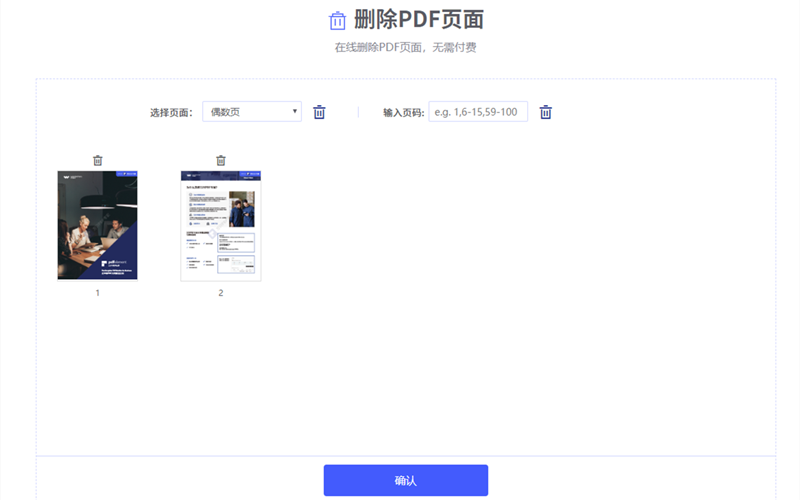步骤3、文件上传完毕后,整个PDF的页面会以缩放图的方式展示在删除PDF功能页面内,将不需要的页面全部删除,剩余的页面组成的PDF就是所需的。点击确认等待软件自动执行。