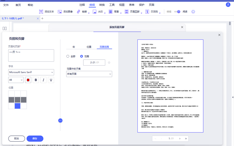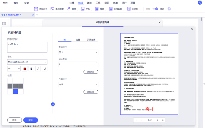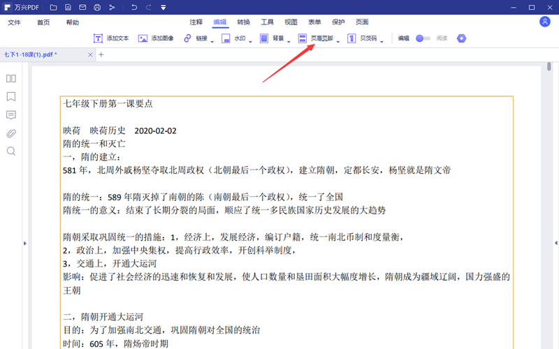 2.使用日韩精品久久久久PDF打开目标PDF,选择进入编辑功能模块或者工具功能模块的更多选项内找到页眉页脚功能图标,点击后选择添加页眉页脚功能。