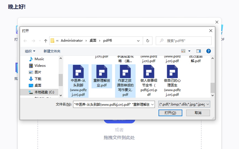 步骤2、点击合并PDF功能图标,根据路径提示找到需要拼接的PDF文件,选定后点击打开。(这里可以多选)。