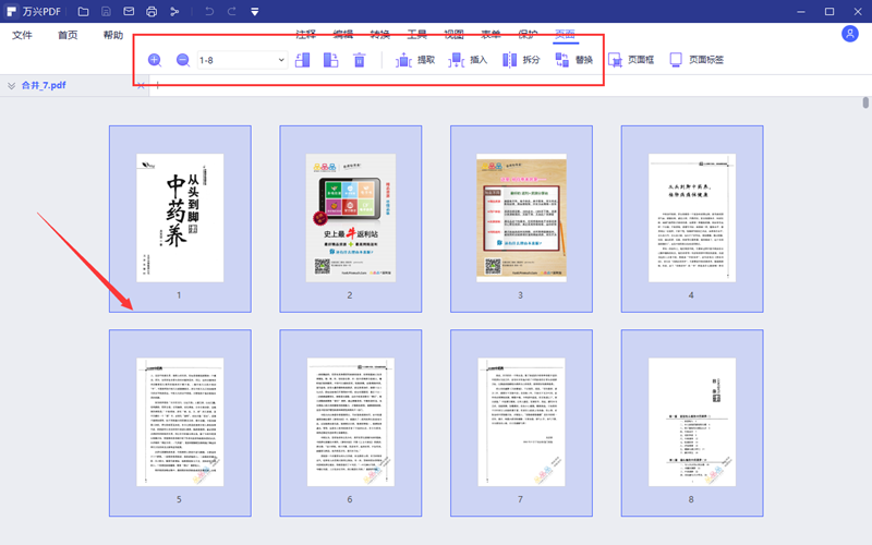 步骤4、软件自动完成合并后会自动打开合并后的新PDF文件,文件的名字以合并开头。点击“页面”进入页面功能模块窗口,合并后的PDF文件会以缩放图的方式展示出来。