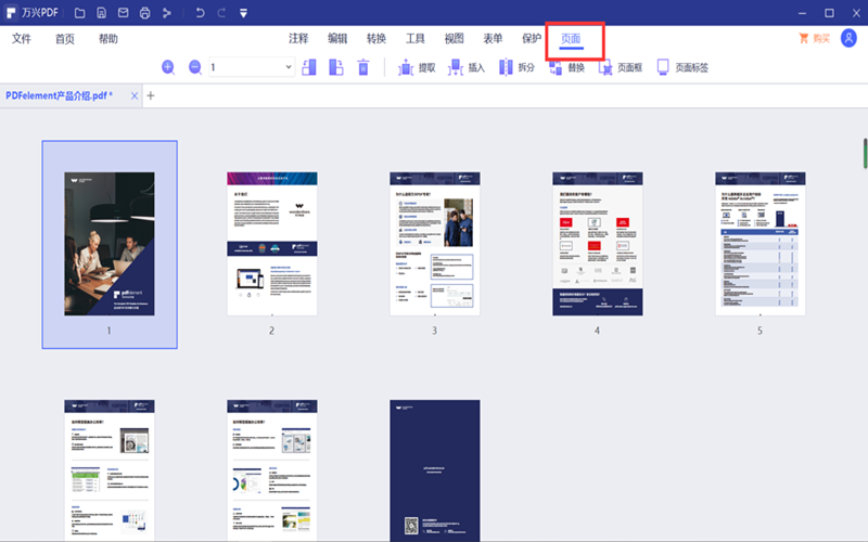 第二步:选择菜单栏下的“页面”选项,这时我们可以开到所有的PDF页面从左到右、从上到下依次排列开来,这时我们就可以选中需要调整的PDF页面,然后拖动到正确的位置就可以了。