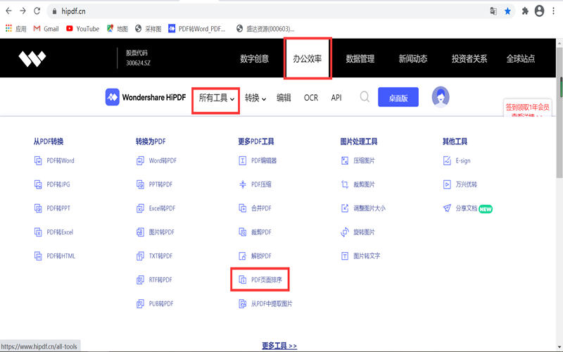 第一步:打开HiPDF网站,在“办公效率”下找到“所有工具”,下拉“所有工具”选择“PDF页面排序”。