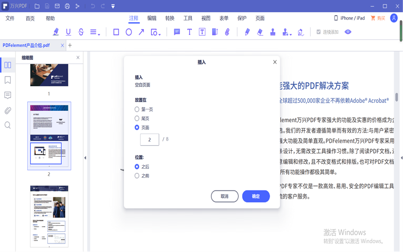 第三步:点击插入会弹出插入页面的选择框,我们可以选择空白页面插入的位置,点击确定。这样就为PDF文件添加了一个空白页面了。