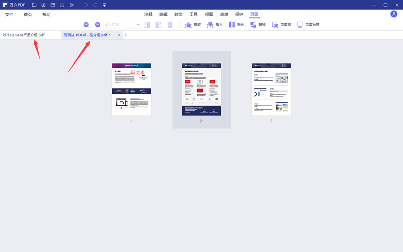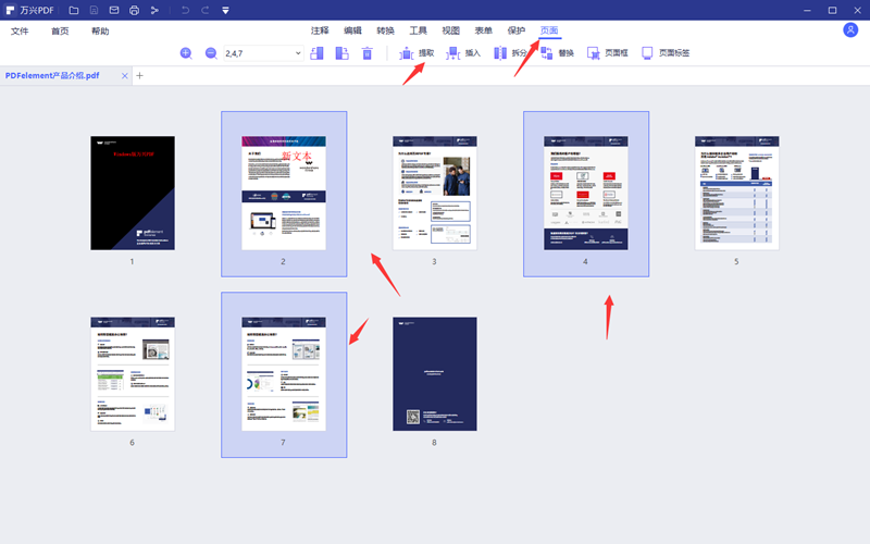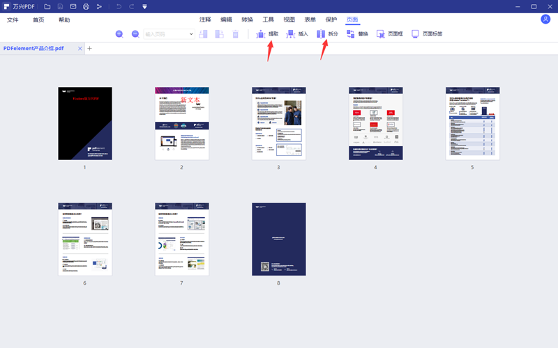 第二步、点击软件上方的“页面”,进入页面功能栏。普通的拆分可以使用拆分功能来完成,如果是随性才拆分就要用到提取功能了。