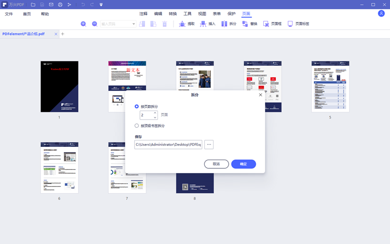 第三步、点击拆分功能,软件会弹出拆分设置页面,软件设置了两种常见的拆分方式供用户选择,通常使用按页数拆分即可。设置好文件要保存的位置后点击确定,软件完成拆分后会提示拆分完毕并且直接打开存储文件夹。