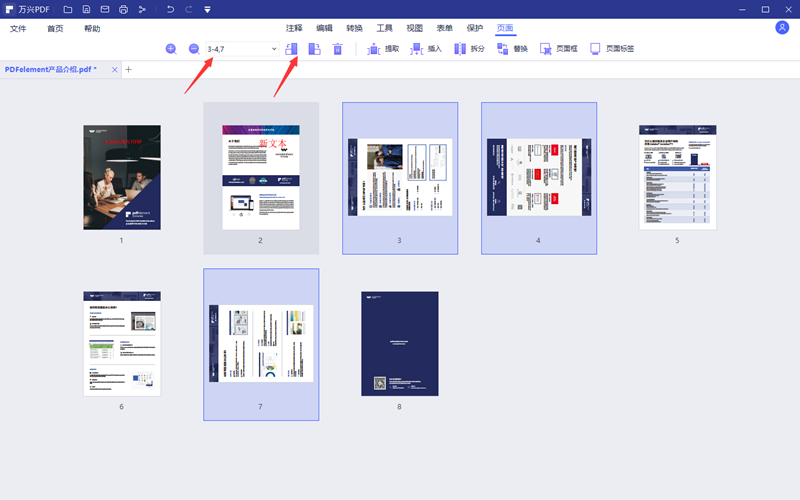 步骤2、点击软件上方的“页面”,进入页面功能栏,整个文档的页面会以缩放图的形式展示在软件窗口内,是否需要旋转,该怎么旋转都一目了然。