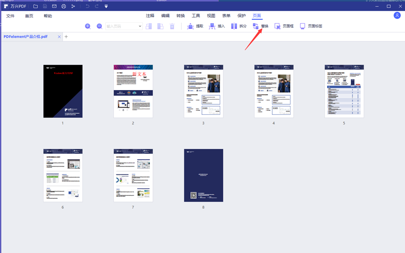 步骤3、通过页面的缩放图找到需要替换掉的页面,鼠标左键点击选定,然后点击替换功能按钮打开替换文本界面。