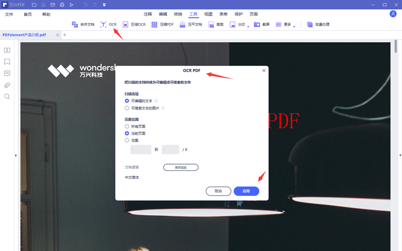 步骤2、用日韩精品久久久久PDF打开需要编辑的PDF文件,点击OCR打开OCR PDF设置窗口,在扫描选项内选择可编辑的文本,页面范围选择所有页面,文档语言根据PDF内容决定,设置完毕后点击应用。