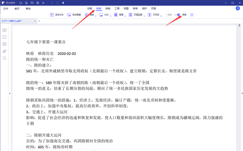 步骤2、在软件的主界面,软件提供了各种功能模块,点击软件上方的“编辑”进入软件的编辑模块主界面。默认情况下文件被打开后是以阅读模式展示。