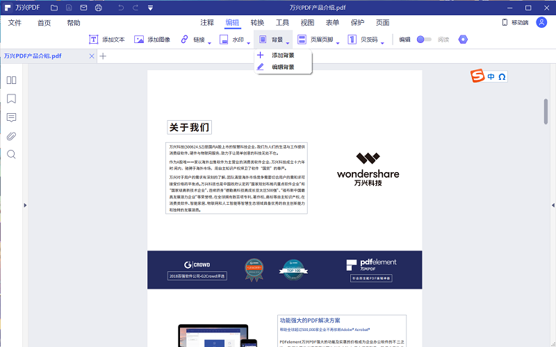 步骤二:打开文档之后就会进入阅读模式,接着再单击编辑功能区,你就可以在下面看到背景颜色功能了。单击“背景颜色”下拉框,就会出现三个选项,分别是“新建背景”、“更新背景”还有一个“删除背景”,现在想要为PDF文档添加纯色背景的话,就选择新建背景。