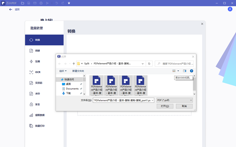 3.选择转换功能,在转换框内点击选择文件,打开路径找到电脑上的需要做转换的PDF文档,这里支持多选,选定后点击打开进入转换设置窗口。