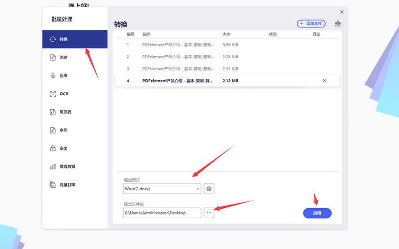 4.通过添加文件图标继续添加PDF文件,直到所有的文件都出现在文件列表中。在输出各种选择Word,设置好输出文件夹的位置后点击应用,软件自动逐个完成转换操作。用户直接去输出文件夹内超看就可以了。