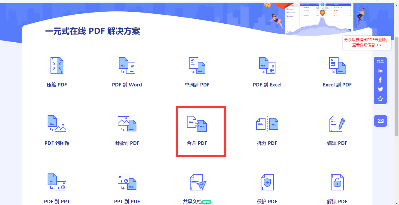 打开电脑里的浏览器,百度搜索HiPDF,然后进入这个小工具的主界面。进入主界面之后我们可以看到有很多实用免费的小工具。在这里我们要进行的是文档合并的操作,所以只选择这一个工具就可以了。