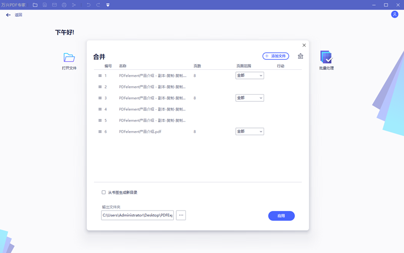 在合并操作界面,点击选择文件添加需要合并的PDF文档。可以是2合一也可以是多合一。一次没有添加选择完毕可以通过添加文件功能继续添加PDF文档。通常需要点掉从书签生成新目录的选项,然后确定合并后文件存放位置即可点击应用。