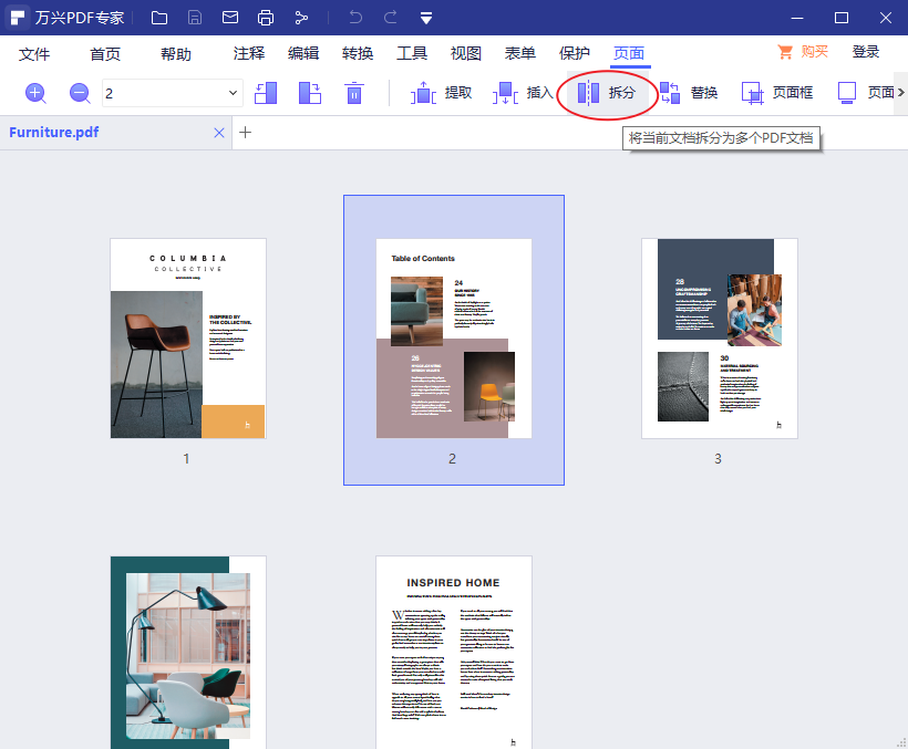 第二步、在日韩精品久久久久PDF的界面上方工具栏选项中,找到“页面”这一栏,鼠标左键单击它。在下方的工具栏中,点击“拆分”。